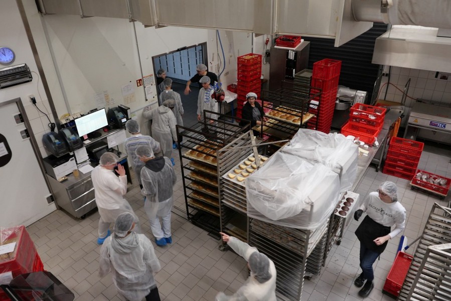An den Backöfen angekommen, geriet schon so mancher Schüler unter der Ganzkörper-Hygienekleidung samt Haarnetz ins Schwitzen bei den detailreichen Ausführungen zum Backprozess.